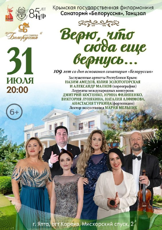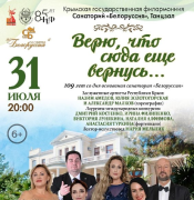 20:00 – «Музыкально-исторический экскурс из жизни санатория «Белоруссия» «Путь успеха» (площадка возле 1 корпуса, шахматный дворик) – крымская государственная филармония Праздничная лотерея, для гостей санатория, в рамках концертной программы, фейерверк из холодных фонтанов.