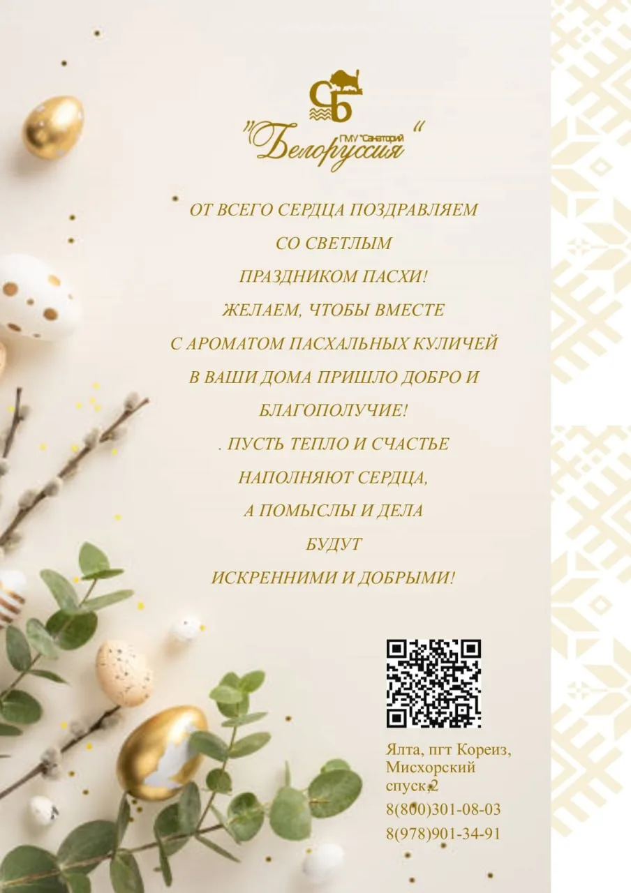 Дорогие друзья! От имени всего коллектива нашего санатория сердечно поздравляем вас со Светлым праздником Пасхи!