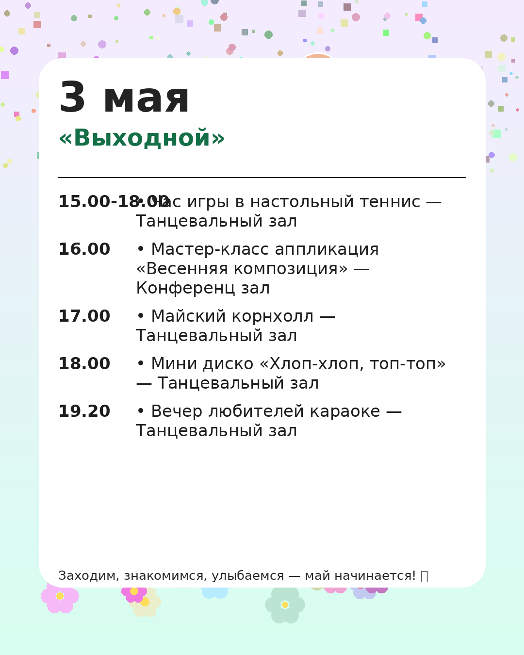 С 1 по 9 мая в нашем санатории вас ждет настоящий праздник весны! Яркие события, спортивные соревнования, конкурсы и развлекательные программы для всей семьи – в санатории «Белоруссия» мы наполним ваш каждый день радостью и впечатлениями.
