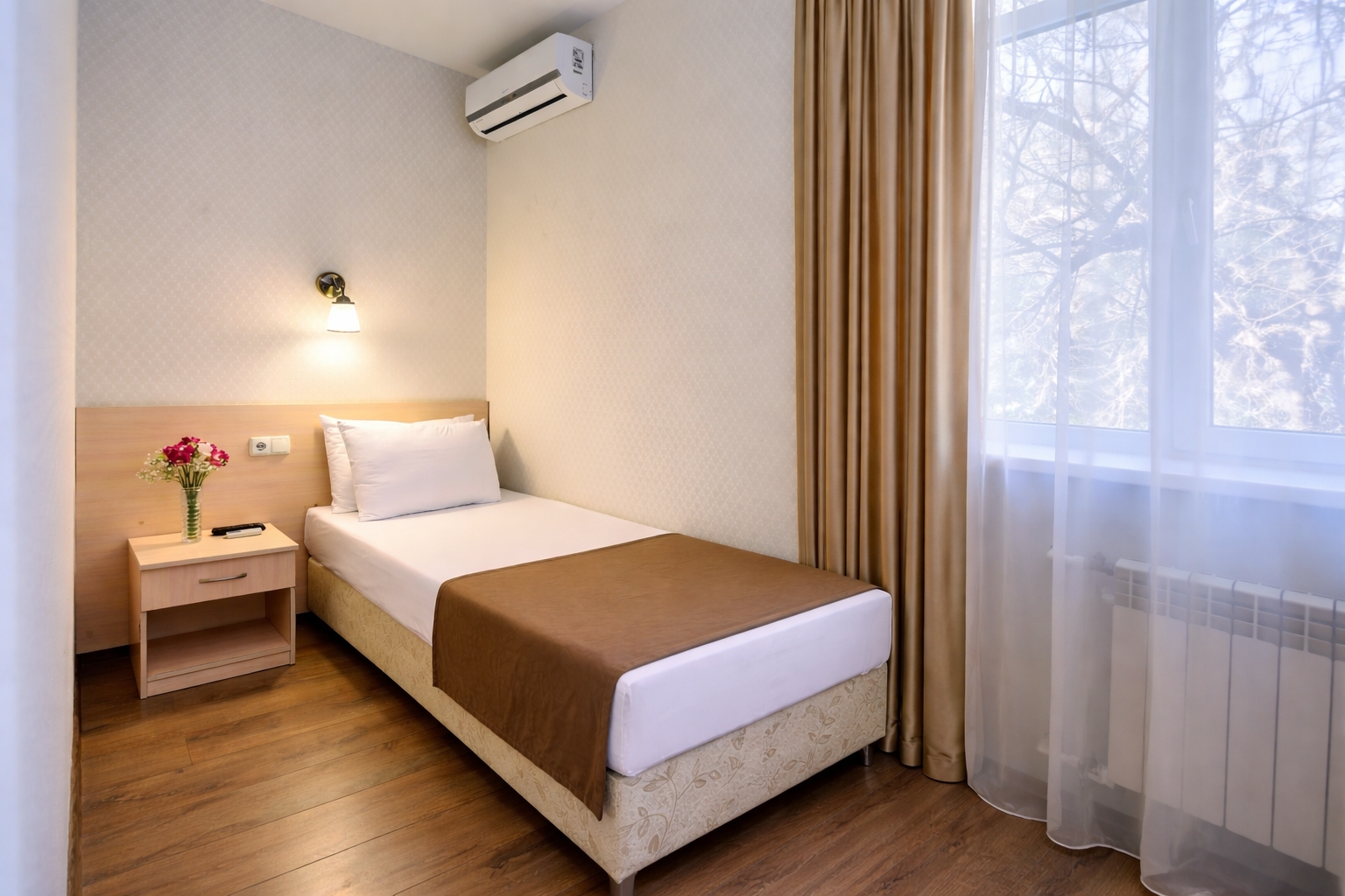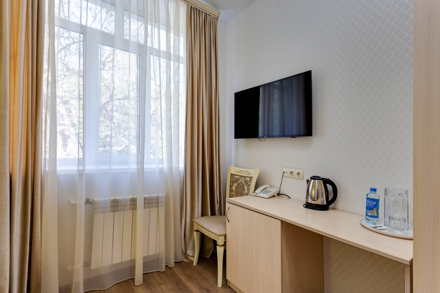 Одноместные номера категории «Стандарт» 3 корпуса — идеальный вариант для любителей уединения. Номера без балкона с прекрасным видом на парк санатория и горы.