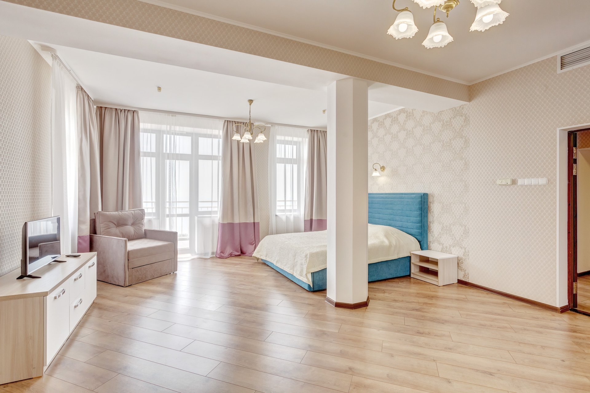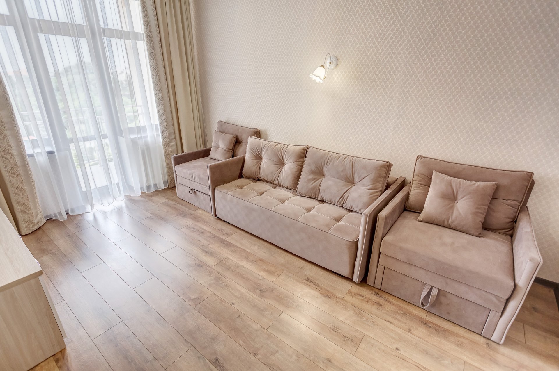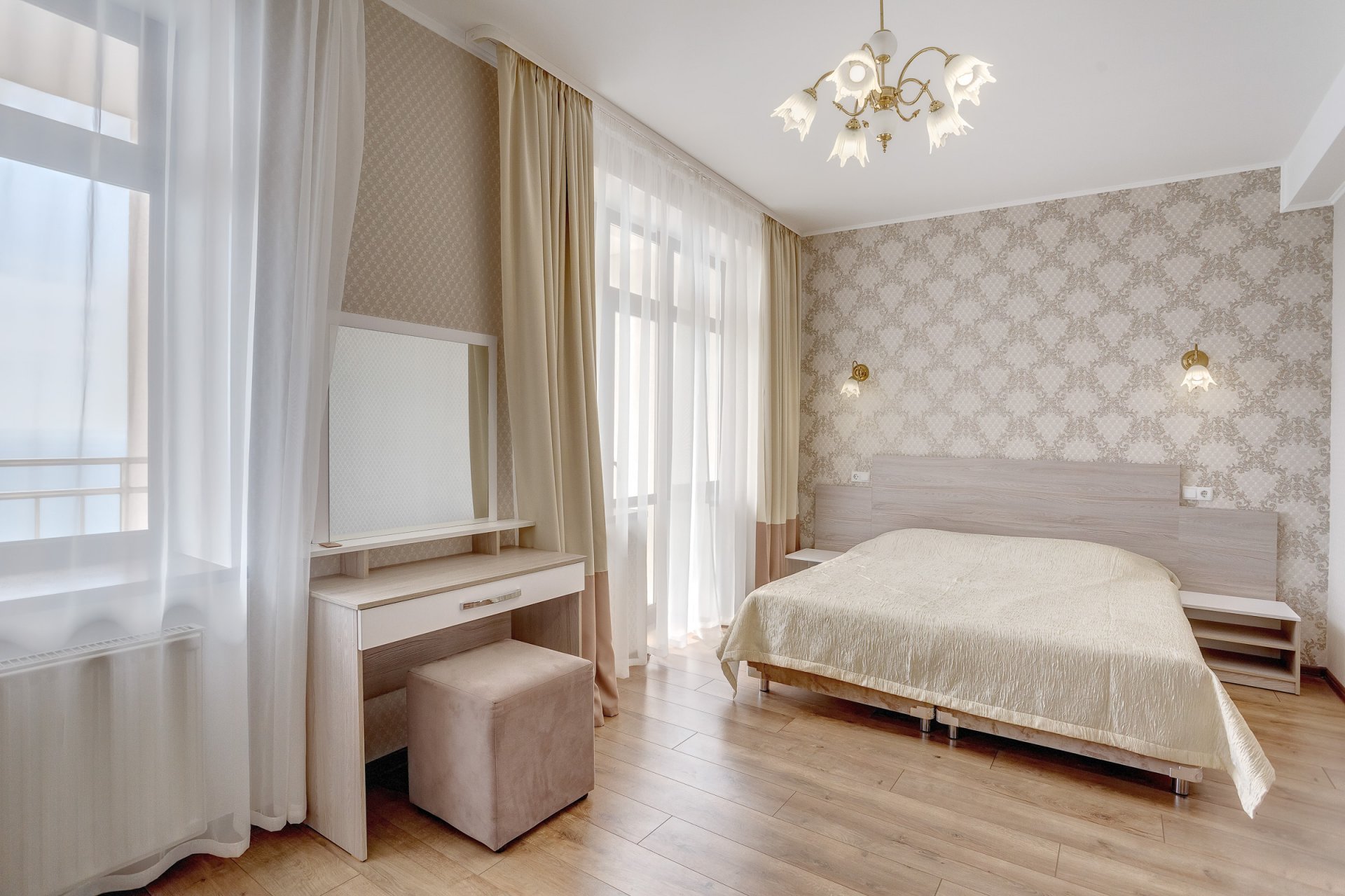 Номера категории «Люкс» представлены двухкомнатными двухместными номерами гостиничного типа в Корпусе 5. Данная категория номеров представлена с балконом, вид на море или на горы, а также на парк санатория.