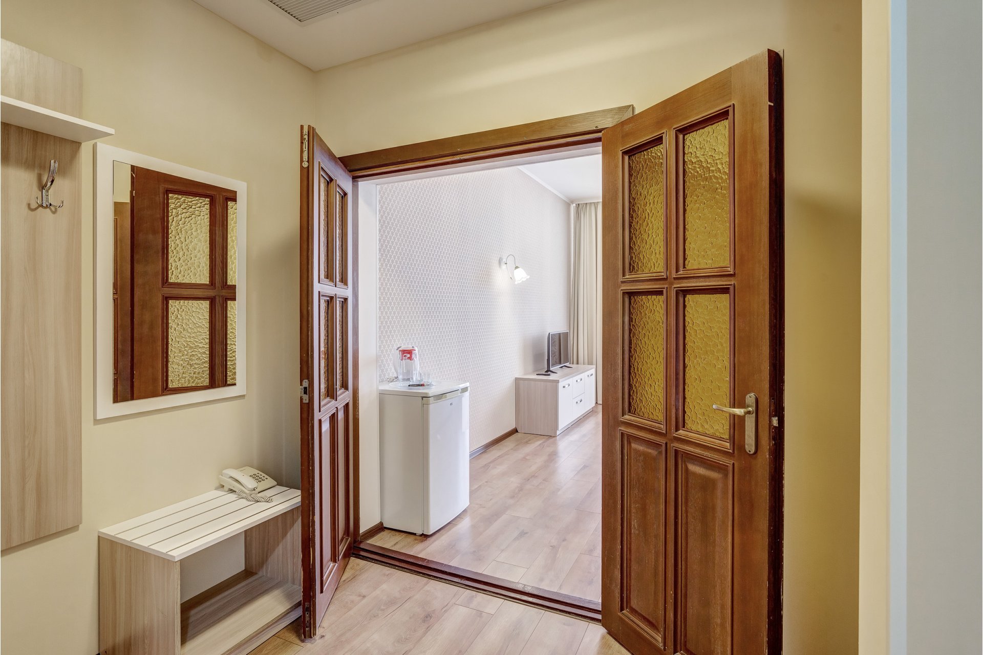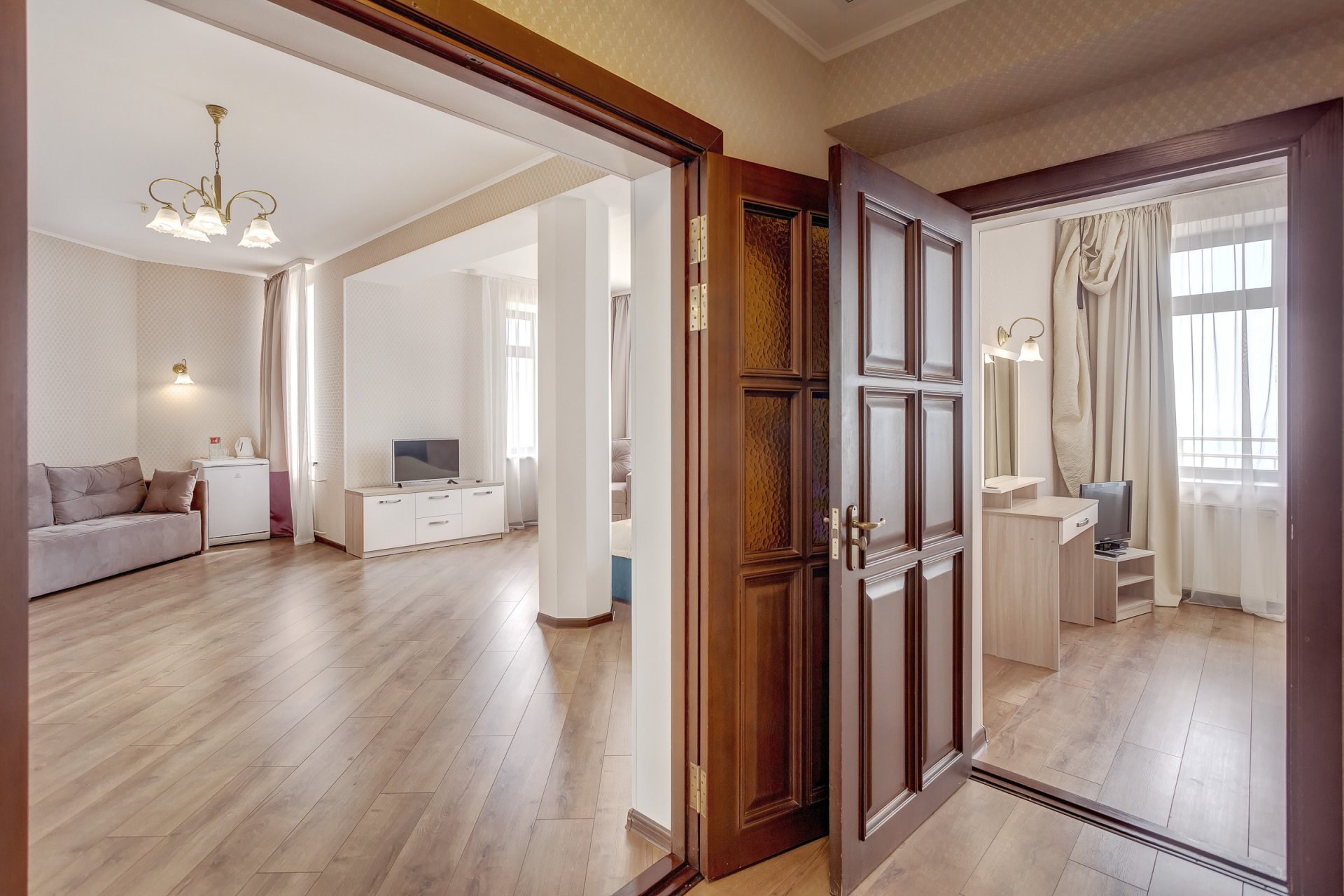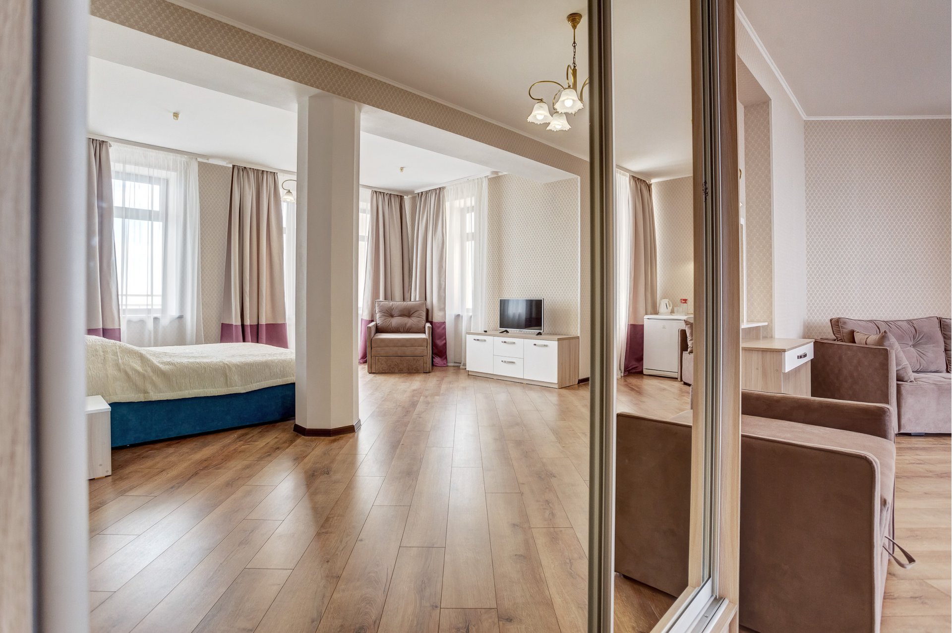 Номера категории «Люкс» представлены двухкомнатными двухместными номерами гостиничного типа в Корпусе 5. Данная категория номеров представлена с балконом, вид на море или на горы, а также на парк санатория.