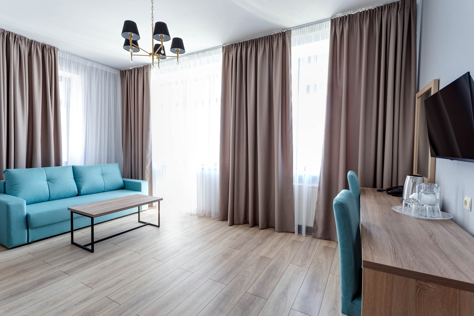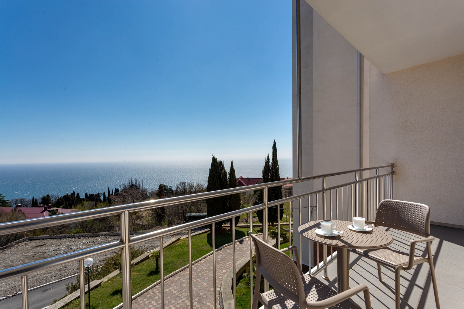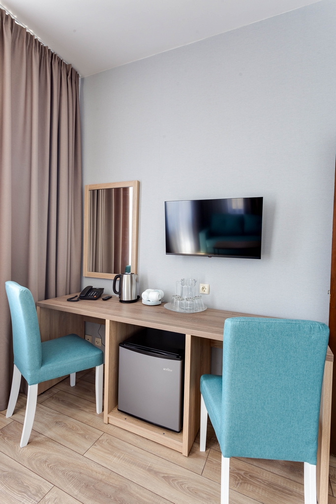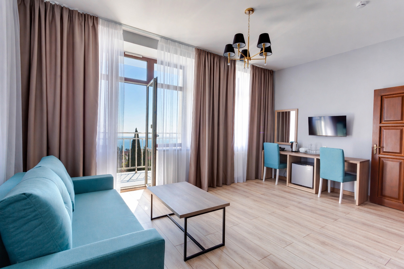Номера категории «Люкс» представлены двухкомнатными двухместными номерами гостиничного типа в Корпусе 5. Данная категория номеров представлена с балконом, вид на море или на горы, а также на парк санатория.